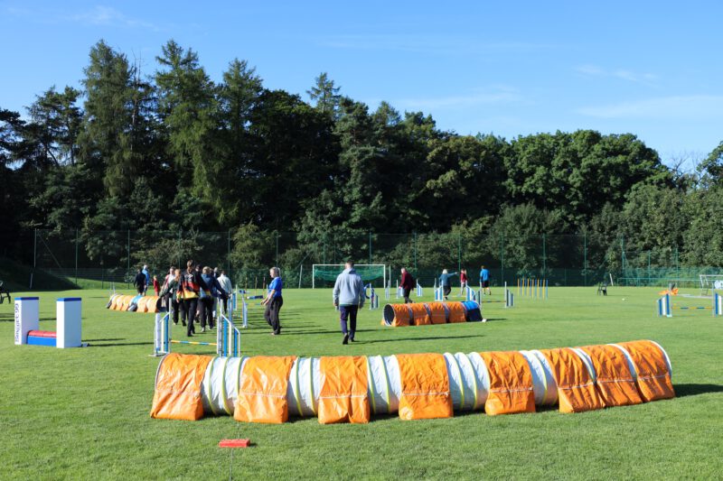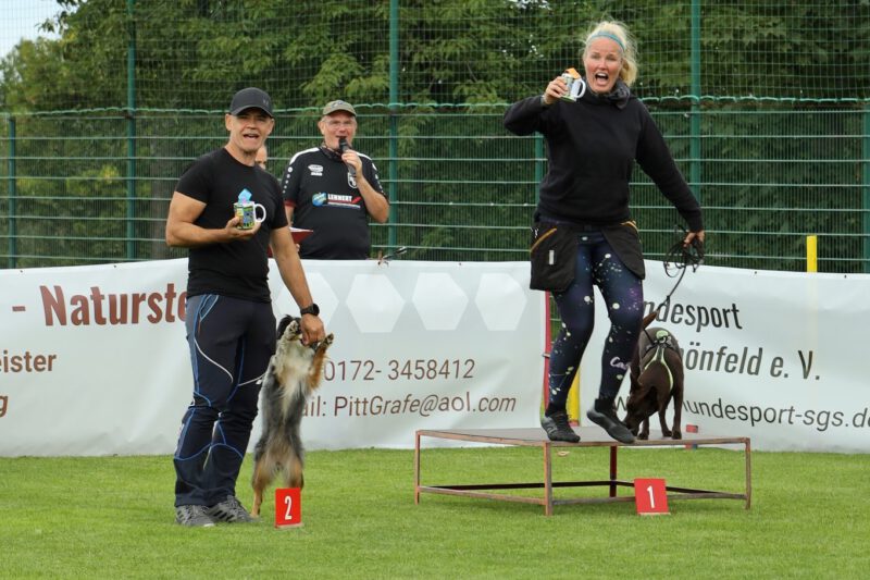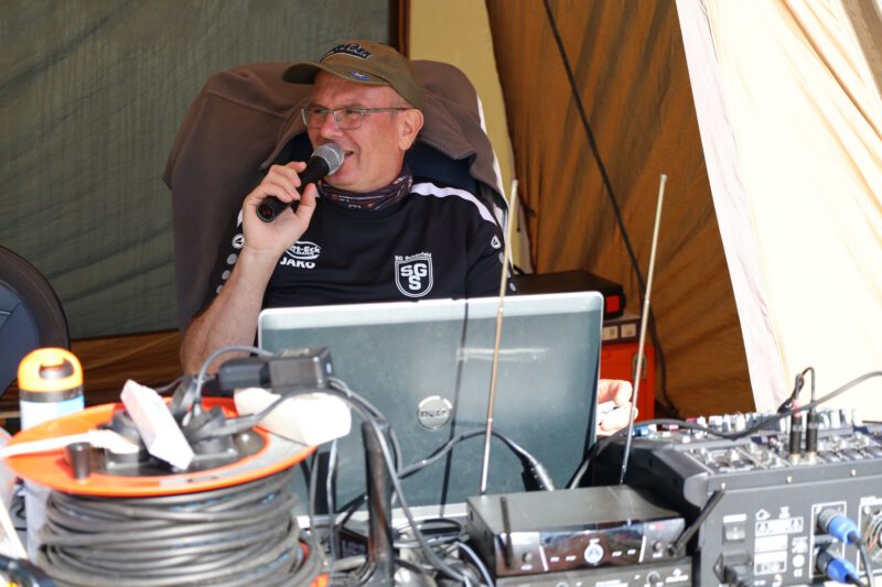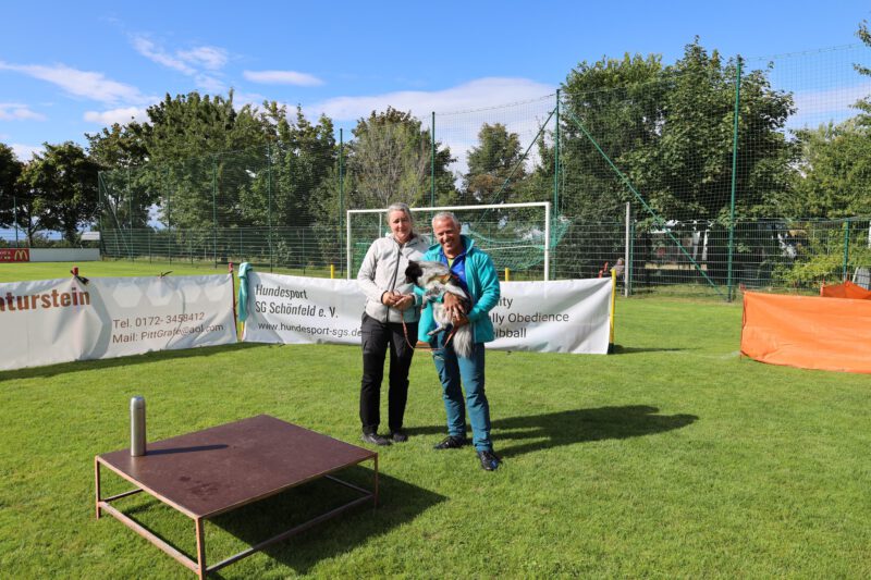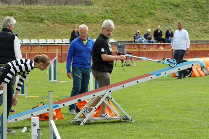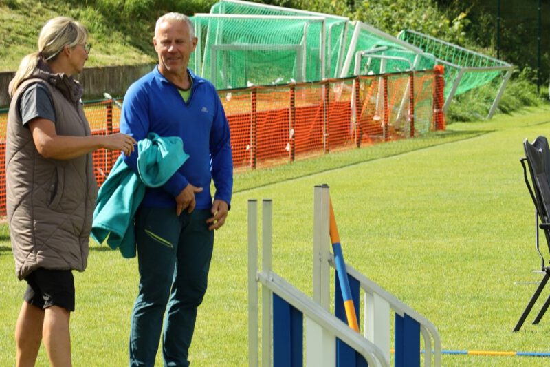 Nein, nicht Fussball … sondern Agility stand am 23. und 24. August in Schönfeld auf dem Programm. Und R.B. steht für René Blank – internationaler Leistungsrichter und Richter der Agilityweltmeisterschaft 2024 … und … ein guter alter Bekannter. Der Kontakt zu René reicht bis ins Jahr 2007 zurück. Damals war er Ansprechpartner und Berater beim 1. Agilityturnier in Dresden. Später richtete er mehrere Turniere und Meisterschaften in Schönfeld. 2014 stand er dann zum letzten Mal auf dem Schönfelder Rasen. Es war also längst überfällig und der 75. Geburtstag des Vereins war ein würdiger Anlass für ein Wiedersehen.